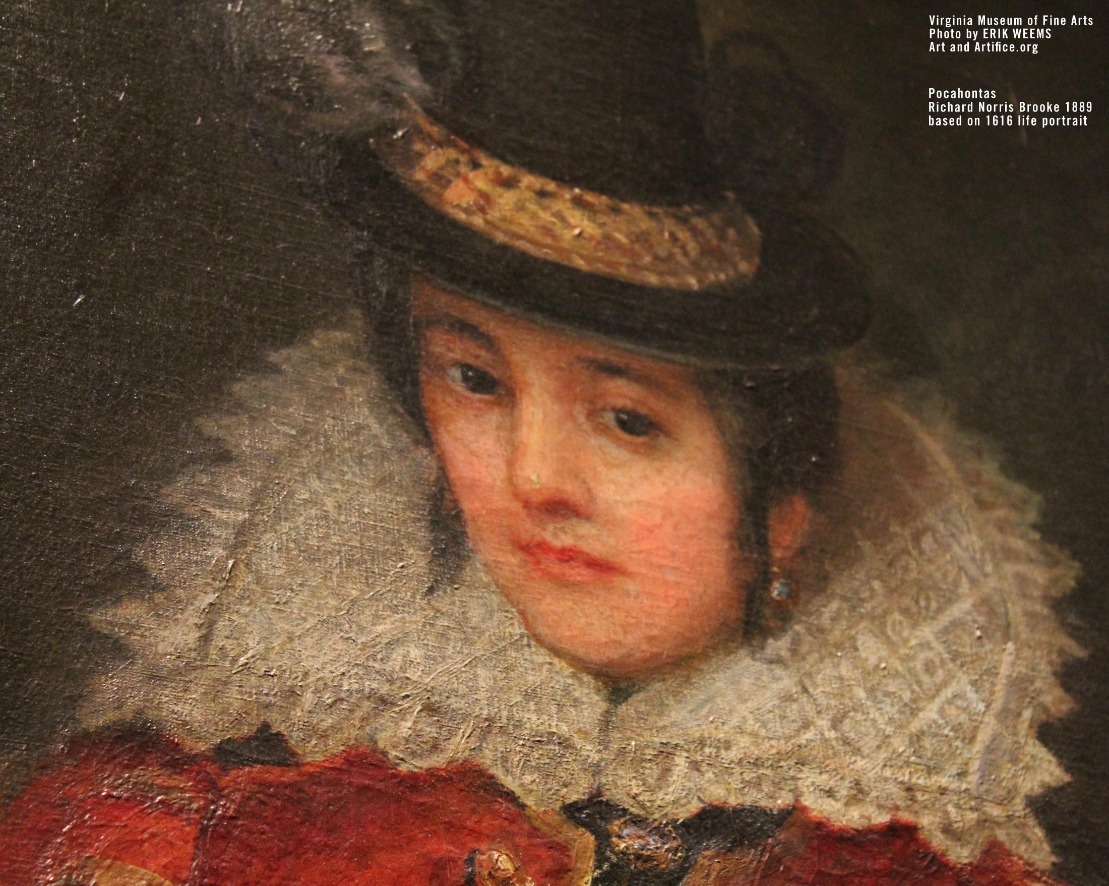 Brooke’s portrayal was painted 250 years after Pocahontas’s death and is based on the only known image made during her lifetime — a 1616 engraving by Simon van de Passe (1595–1647). This image had already been copied and used by other artists for portrayals of the famous woman. Brooke’s painting closely follows the original monochrome engraving by van de Passe, a skilled printmaker known for his portraits of royalty, explorers, and political figures. Van de Passe worked in Britain, Denmark, and in the Dutch Republic, where he was born.